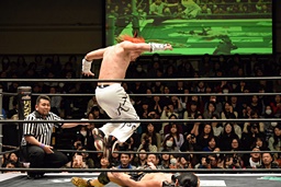 高梨がコーナーに上ってダイビングダブルニードロップ(左写真)。