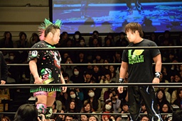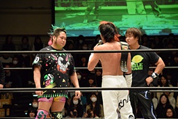 イサミ「じゃあ2人に一言ずついいましょうか。HARASHIMAさん、次は両国でシングルですね。その時は立場も代わって僕が防衛しますよ。」(右写真)
