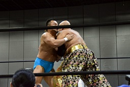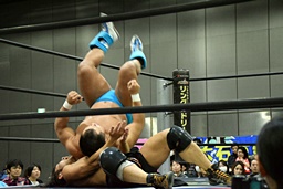 松永2発目のバックドロップはそのままホールド(右写真)、カウント2。