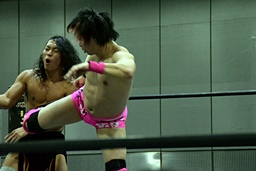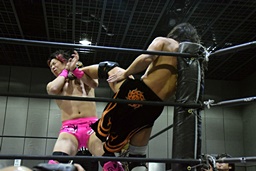 コーナーに上ってミサイルキック(左写真)、星誕期にタッチ。