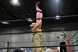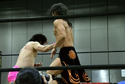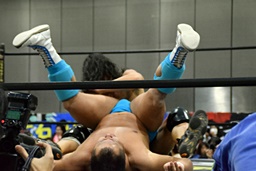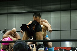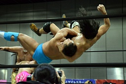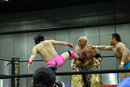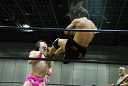 首投げからサマーソルトドロップ(右写真)、カウント2。松永にタッチ。