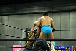 マイティ井上風サマーソルトドロップ連発(右写真)、カウント2。石井にタッチ。