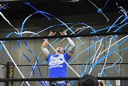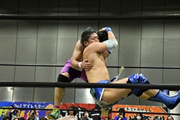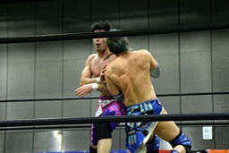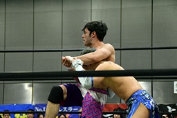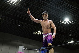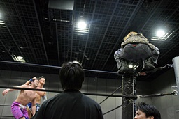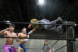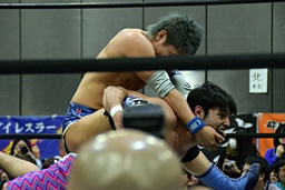 ワンチューロ大石をコーナーに振って串刺しエルボー、助走つけてゴムゴムのピストル(左写真)、カバー、カウント2。