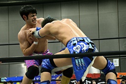 ニラを無視して2人でロックアップ(右写真)、ワンチューロヘッドロック、