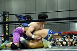 大石切り返してヘッドロック、ワンチューロ腕取って切り返す(右写真)、ヘッドロックに。