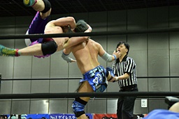 セコンドの鈴木大が「ニラさんを渡瀬が捕まえたけど暴れてて人手が足りない。」と木曽レフェリーを連れ出す。大石ドロップキック、ボディスラムからキャメルクラッチ(左写真)、ワンチューロギブアップするがレフェリーは不在。