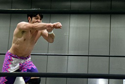 ワンチューロガットショット、大石をコーナーに振って突っ込む、大石カウンターのキック(右写真)、