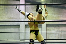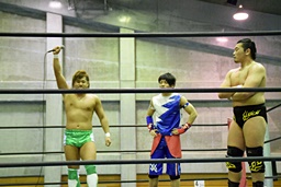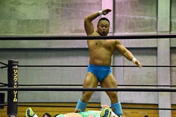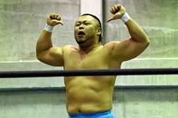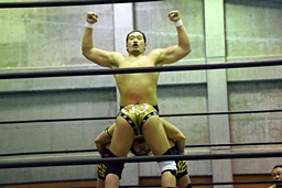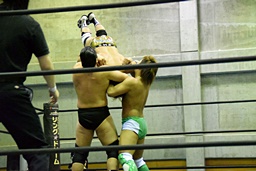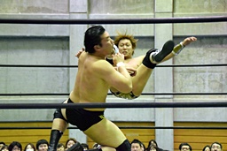 岩崎と2人で合体式ダブルアームスープレックス(左写真)、