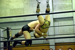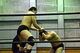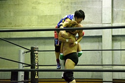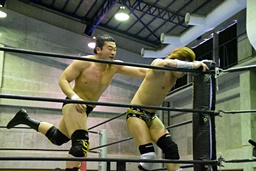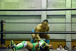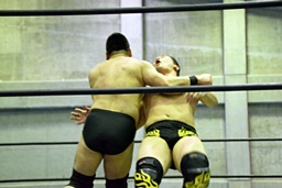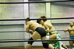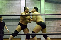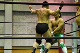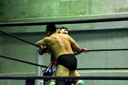 樋口ヘッドロック、高木ロープに振ってショルダーブロックの打ち合い(右写真)、樋口打ち勝って岩崎にタッチ。