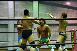 松永バックエルボー、樋口と岩崎が入ってくるが、松永は勝俣の足を払って2人にドロップキック打たせる形に(左写真)。