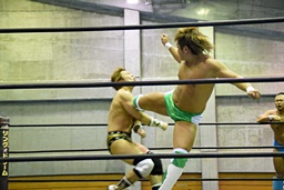 平田エルボー(右写真)、ロープに飛ぶ、岩崎がジャンピングハイキック。