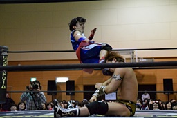 コーナーに上ってムーンサルトプレス(左写真)、カウント2。