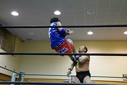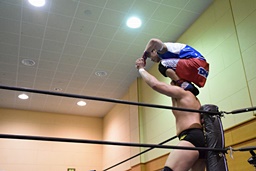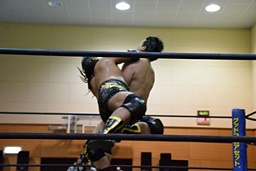 再度コーナーに上ってダイビングクロスボディ、高木キャッチ(右写真)、