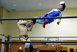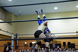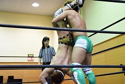 岩崎がコーナーに上る、平田も上って雪崩式ブレーンバスター狙う(右写真)、