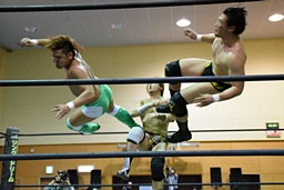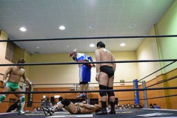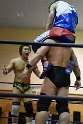 勝俣首投げからドロップキック(左写真)、フットスタンプ、カウント2。ストンピング打ち込んで岩崎にタッチ。岩崎ボディスラム、顔面踏み付け。立たせてミドルキック、樋口にタッチ。