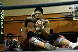遠藤持ち上げるが坂口は背後に着地してスリーパー(左写真)。