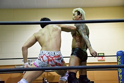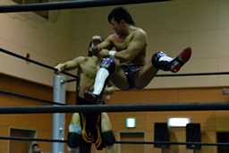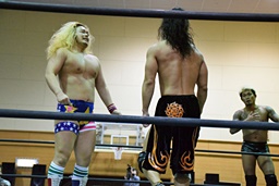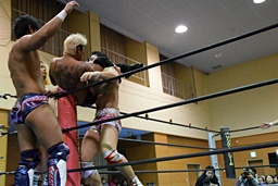 竹下逆水平(右写真)、ロープに振る、坂口切り返してミドルキック、高梨にタッチしようとするが伊橋がタッチ受ける。
