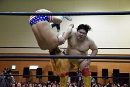 竹下伊橋にブレーンバスター狙うが上がらない(左写真)。