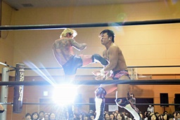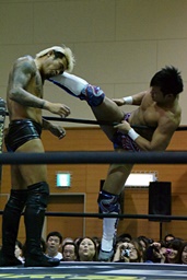 福田が長渕を歌うと伊橋も乗る。坂口が入って伊橋にハイキック(右写真)、自分がリングイン。