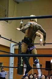 コーナーに飛び乗ってスワンダイブエルボー(左写真)、竹下にタッチ。