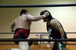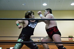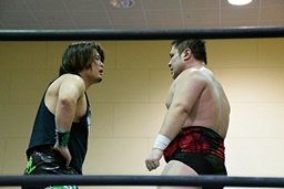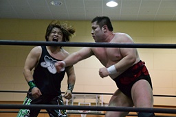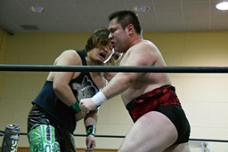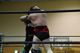 両者カウント9で立つとロックアップ(左写真)、客席からは拍手が起きる。