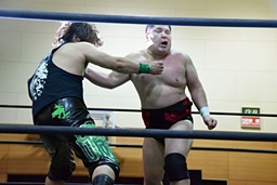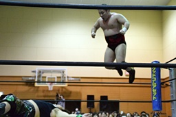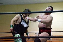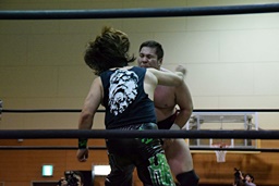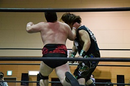 アントンボディスラム、コーナーに上ってダイビングフィストドロップ、ウラノは両足を立てて迎撃(右写真)。