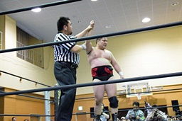 松井レフェリーが勝ち名乗り(左写真)。