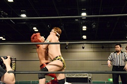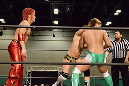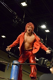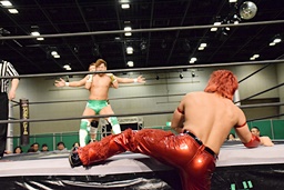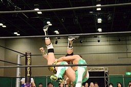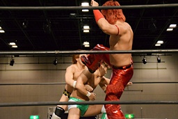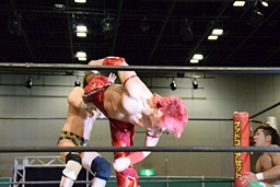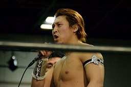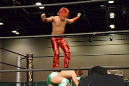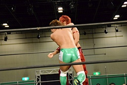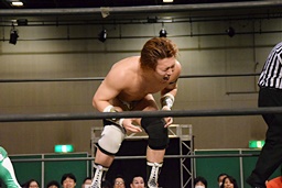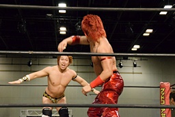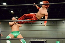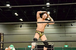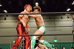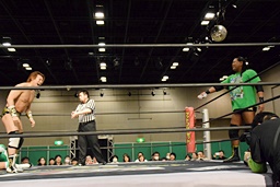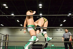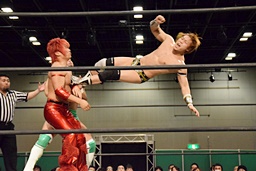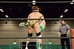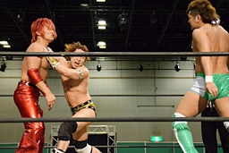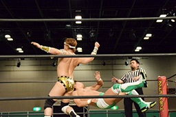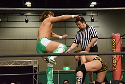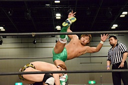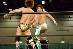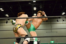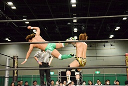 岩崎ロープに飛ぶ、高尾はリープフロッグからドロップキック(左写真)。高尾ヘッドロックからフライングメイヤー、岩崎ヘッドシザーズ。高尾ブレークして場外に。