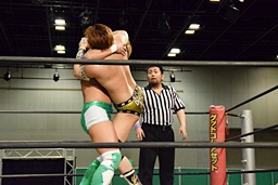 平田がチャンスと見て攻め込むが岩崎かわしてバックドロップ(右写真)。