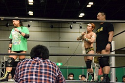 高木、大鷲もリングに上がる。平田「正真正銘の3カウントでしょう!この前哨戦すべてT2ひーの勝利だ!DNA、お前らこのまま後楽園で挑戦する資格ねえよ。お前らに俺のGO!もダンスも必要ないんや!でも、この平田さんの心意気でタイトルマッチやってやるから、せいぜいトレーニングして強くなってください。」(左写真)