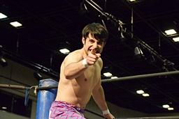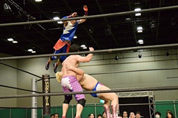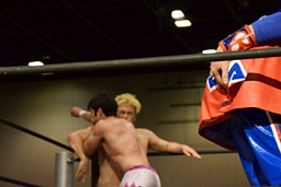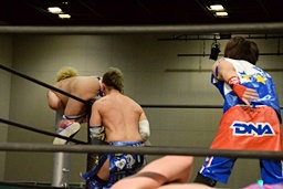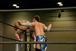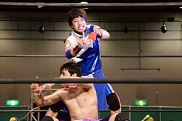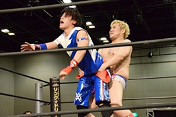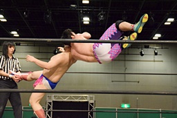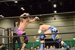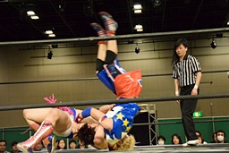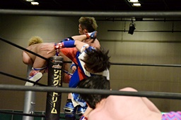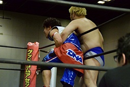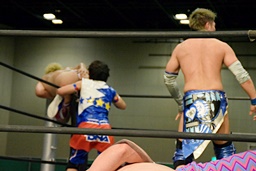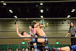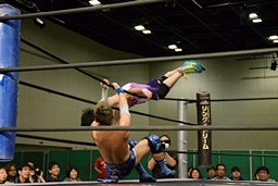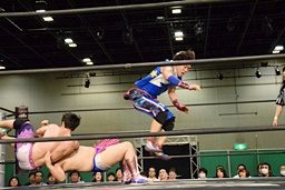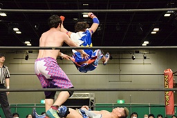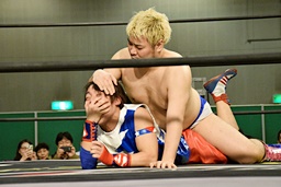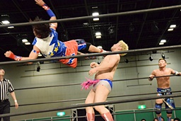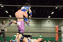勝俣ドロップキック連打(右写真)、ワンチューロにタッチ。