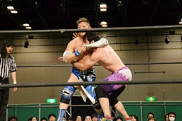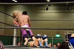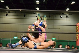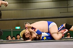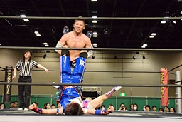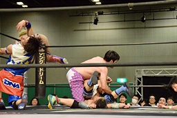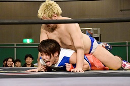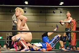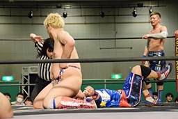 大石が両足を抱え込み(右写真)、カタプルパでディーノの股間に。大石がカバー、カウント2。ディーノにタッチ。