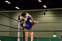ワンチューロ鶴拳のような構え(右写真)。大石を捕えるとボディスラム。