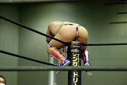 ただ抱きついてるだけにも見える(右写真)。勝俣なんとかロープエスケープ。5分経過。