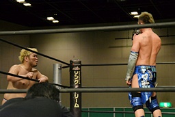 先発は大石とワンチューロ。ロックアップ、大石ヘッドロック(左写真)、