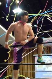ロープに飛ぶ、ワンチューロはカウンターのラリアット(右写真)。
