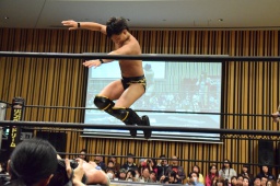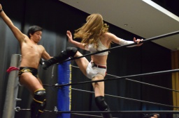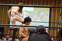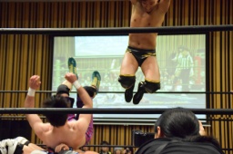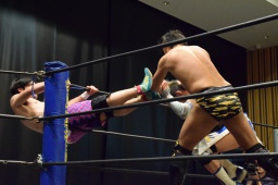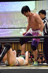 赤井ロープに飛ぶ、渡瀬カウンターで高角度ドロップキック(右写真)、カバー、カウント3。