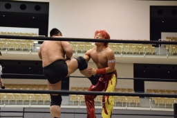 大鷲高尾を対角線コーナーに振って突っ込む、高尾かわしてハイキック(左写真)、