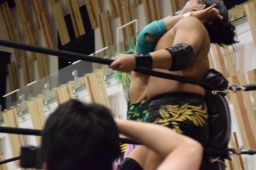 高木ブレーンバスター狙う、入江はブロック、ジャンピングブレーンバスターに切り返す(左写真)。