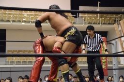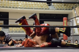 変形のエビ固めに(左写真)、これでカウント3。