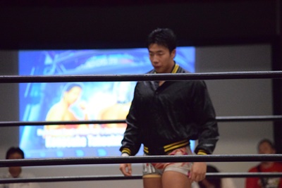 竹下幸之介が先にリングに(右写真)。「十二年」というのは竹下が大阪プロレスのプロレス教室に通っていて、当時トップヒールだったZEROの恐ろしさを体感した時から、という話。なのでHUBではなくZEROとの対戦を要求した。
