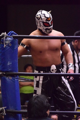 ZEROマイク取ると「おい、幸之介。俺はZEROだ。試合でマイクは使わない。負けてマイクを持つヤツは情けないと思っている一人なんだけど今日は特別だ。お前が大阪プロレスで俺と接してから今まで、俺と闘うためにレスラーになるって言ってくれてたな。いろんな感情があるけど、一番はうれしかったよ。でも今日でZEROを追うのは終わりにしよう。なんでかって言ったら、今日の試合でお前が勝って、一発でこのZEROを超えたからだ。おい、竹下幸之介。このマスクはお前と今日対戦するために作った。それ以外に価値はない。このマスクもらってくれ。」(左写真)