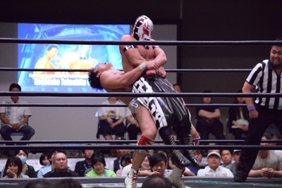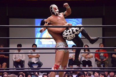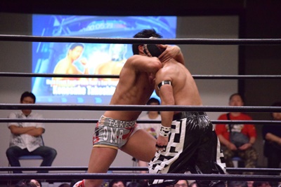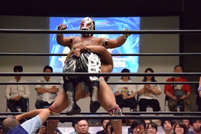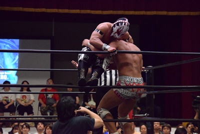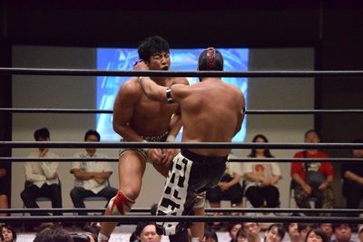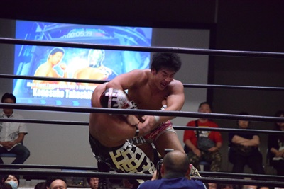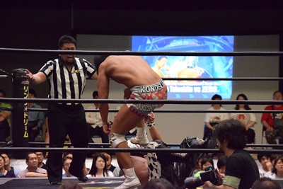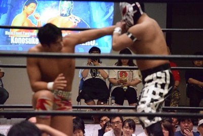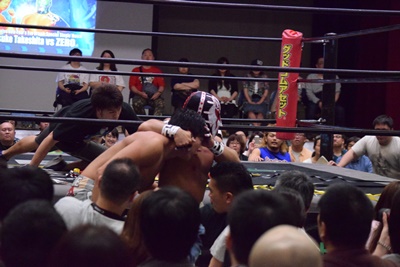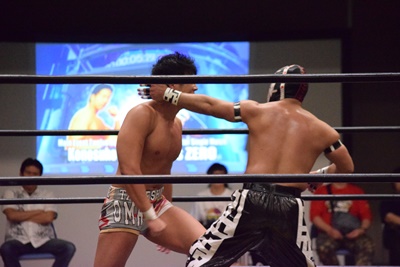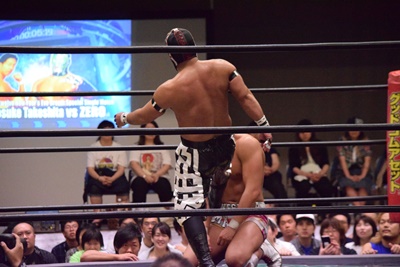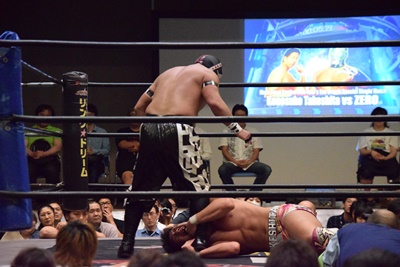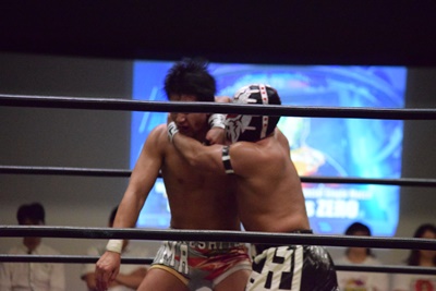 ZEROスキを突いて急所蹴り(左写真)。ZERO竹下を場外に出して客席に投げ込む。