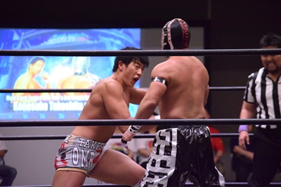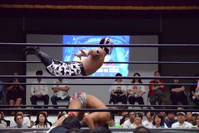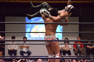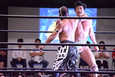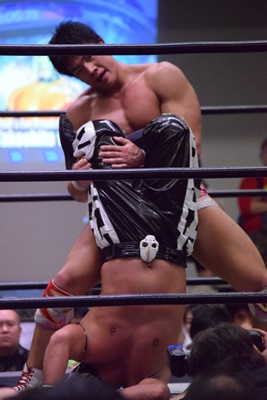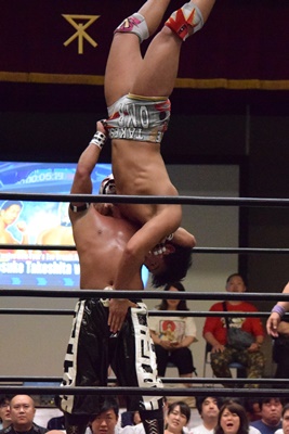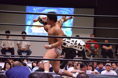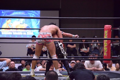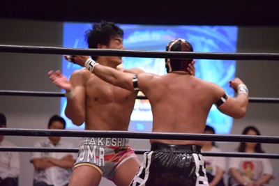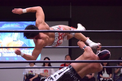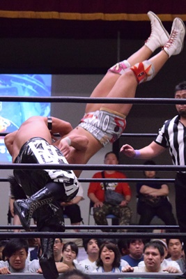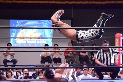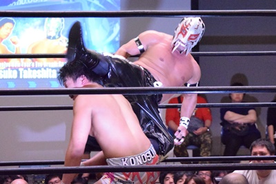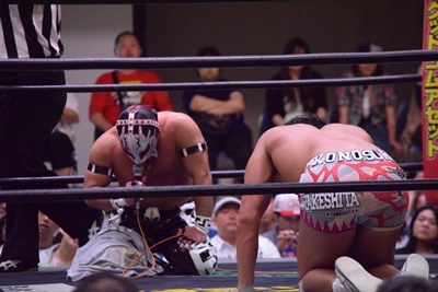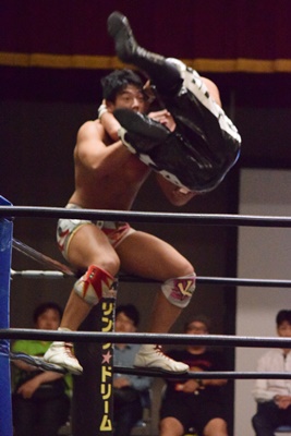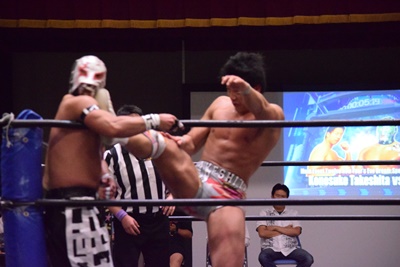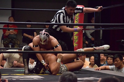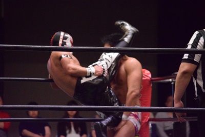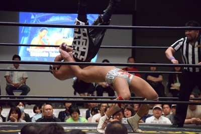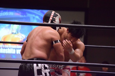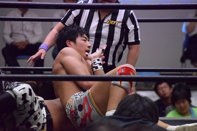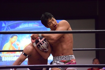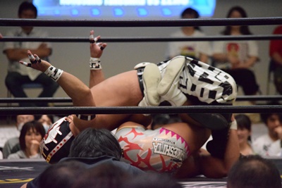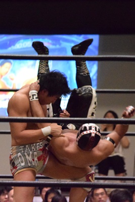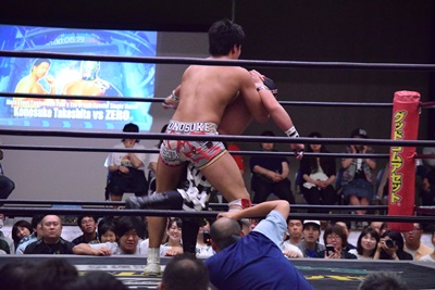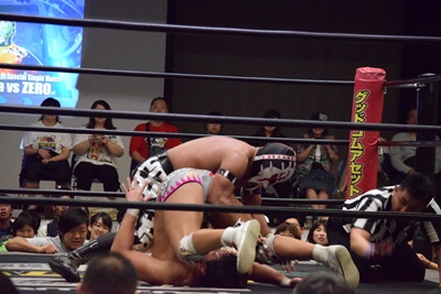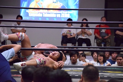 ZEROラリアットをかわして背後に回ると竹下の体勢を崩して丸め込む(左写真)、カウント2。20分経過。