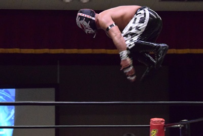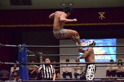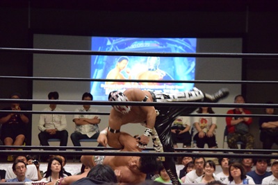 竹下コーナーに上ってジャベリンキック(右写真)。