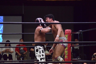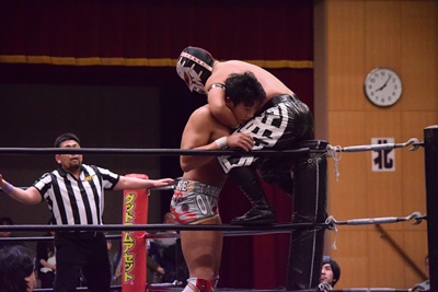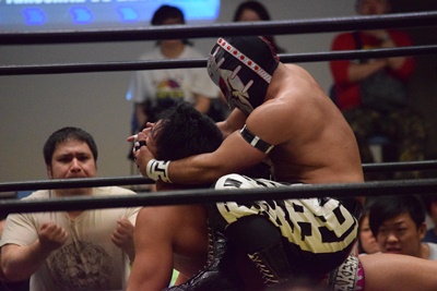 竹下サイドヘッドロックから(右写真)首投げ、スリーパーに。ZEROロープ。