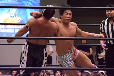ZEROエルボー(左写真)、竹下も打ち返す。