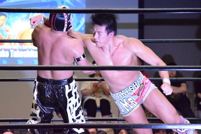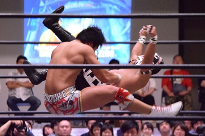 ZEROエルボー、ロープに飛ぶ、竹下カウンターのゼロ戦キック(左写真)。
