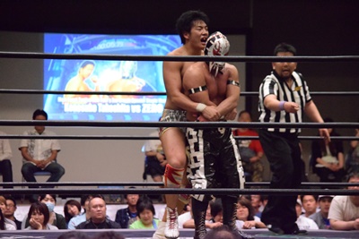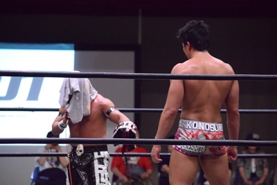 ZEROはマスクを脱ぎ、竹下に渡す(右写真)。「これでZEROとはおさらばだ。お前がDDTを背負って立つレスラーに、プロレス界を背負って立つレスラーになろうがZEROは知ったこっちゃねえ。でもお前が今日この試合で感じたことを忘れて、しょうもない試合をするなら東京まで行ってボコボコにしてやるからな!」