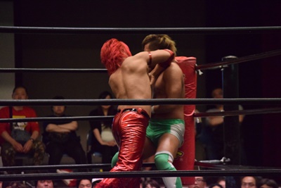 石井ロープに背中で押し込む、高尾がエプロンから延髄蹴り(左写真)。